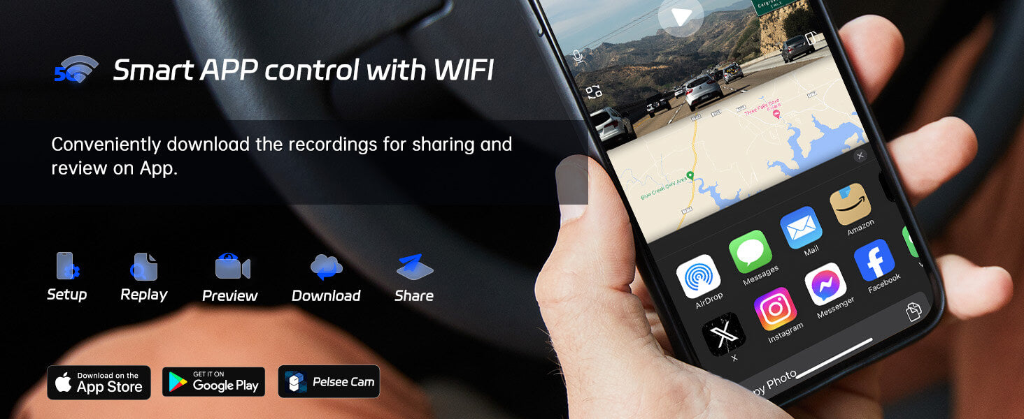 - Effortless Video Transfer via App: Easily connect your phone to the dash cam's built-in WiFi to configure settings, playback, download videos, and share your favorites on social media using the Pelsee App—making everything simple and convenient.