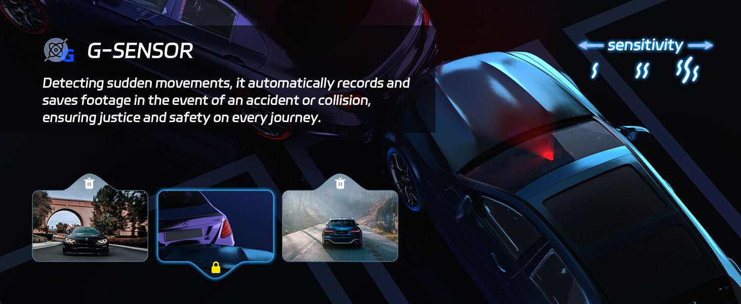 - Loop Recording/G-sensor/Time-lapse Recording: Loop recording ensures continuous footage by overwriting the oldest files when the memory card is full. The G-sensor detects sudden collisions and locks the footage, while time-lapse mode compresses 30 minutes of video to save power and storage.