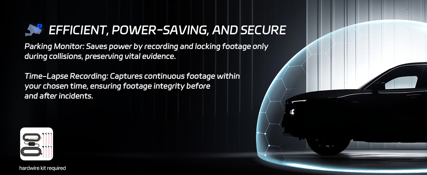 - 24H Parking Monitor: The parking monitor activates the front and rear cameras to record a locked video for about 20 seconds if the G-sensor detects a collision while parking. An additional ACC hardwire kit is required for this feature.